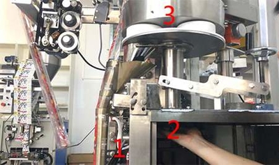 量杯計(jì)量裝置相對(duì)電子秤稱重下料的精度差一點(diǎn),但是實(shí)惠。量杯計(jì)量裝置下料與封口不一致,需要調(diào)整量杯料位與下料封口的時(shí)間,如果下料快,需要把1的手柄打下來(lái),然后把2的凸輪托起來(lái),如果下料快,把轉(zhuǎn)盤(pán)標(biāo)示3往逆時(shí)針?lè)较蜣D(zhuǎn)一點(diǎn),如果下料慢,則把轉(zhuǎn)盤(pán)往順時(shí)針?lè)较蜣D(zhuǎn)一點(diǎn)。