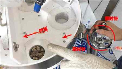 顆粒包裝機(jī)量杯計量裝置上的手柄往順時針方向扭動,扭動至物料與萬能量杯平齊,如果52g珍珠丸子低于萬能量杯,那么把量杯計量裝置上的手柄往逆時針方向扭動。調(diào)節(jié)好后,量杯計量裝置在旋轉(zhuǎn)的時候物料經(jīng)過擋板的時候,沒有卡料就證明調(diào)節(jié)好了。如下圖